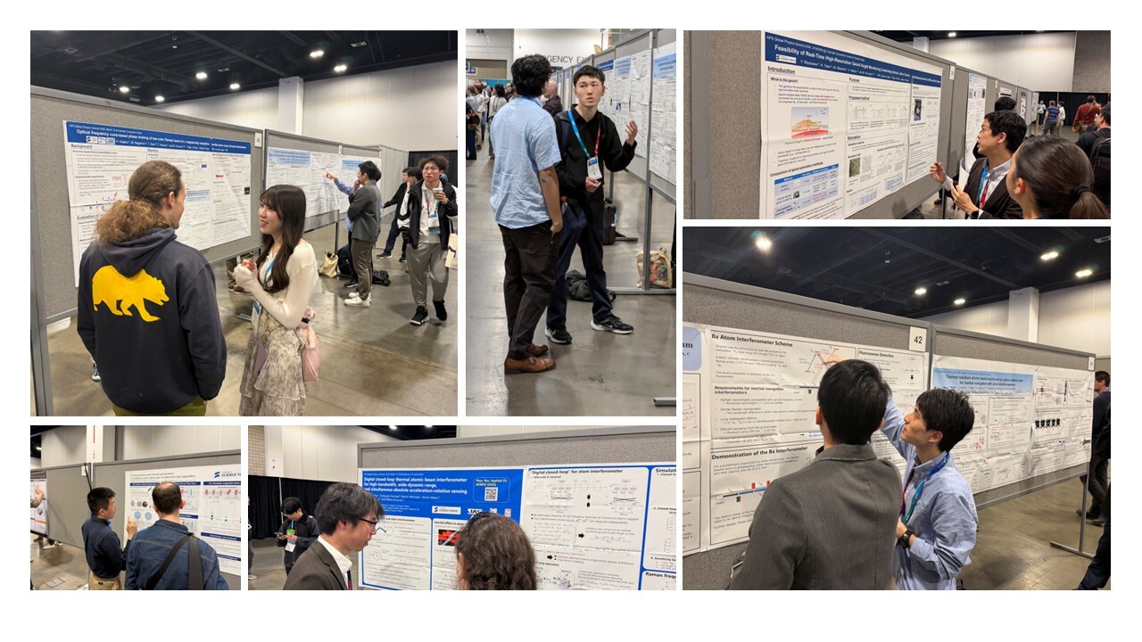 佐藤先生は 「Digital closed-loop thermal atomic-beam interferometer for high-bandwidth, wide-dynamic-range, and simultaneous absolute acceleration-rotation sensing」、宮澤先生は 「Feasibility of real-time high-resolution geoid height monitoring combining optical lattice clocks, inertial measurement unit, GNSS, and star trackers」、松井先生は 「Probing spontaneously formed spin textures in a europium spinor dipolar gas via tilted-axis spin separation」、長森君は 「Toward a transportable, magnetically insensitive inertial sensor: Proposal and demonstration of a Mach?Zehnder atom interferometer using barium」、亀井君は 「Thermal rubidium atomic beam source using a glass capillary plate for inertial navigation with atom interferometers」、波多野さんは 「Optical frequency comb-based phase locking of two-color Raman lasers for a magnetically insensitive inertial sensor using a Ba atom interferometer」 というタイトルで発表を行いました!
