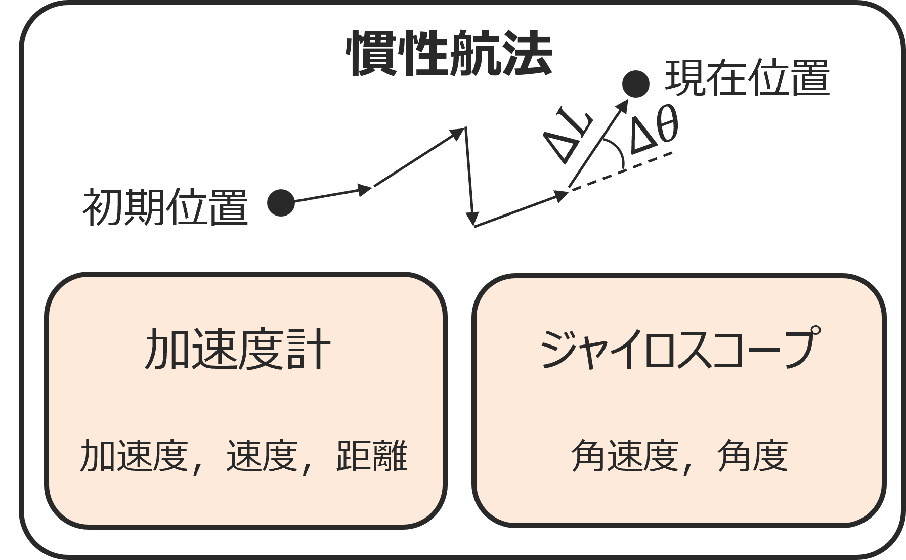 加速度計が出力する加速度を時間で2階積分すれば変位がわかり、ジャイロスコープが出力する角速度計を時間で1階積分すれば角度増分がわかります。初期位置さえわかっていれば、これらの情報を順次つなぎ合わせていくことで自分の位置を推定することができ、これを慣性航法と呼びます。この方法は外部からの信号に全く頼らないため、時計と同様に完全に「自律したシステム」です。