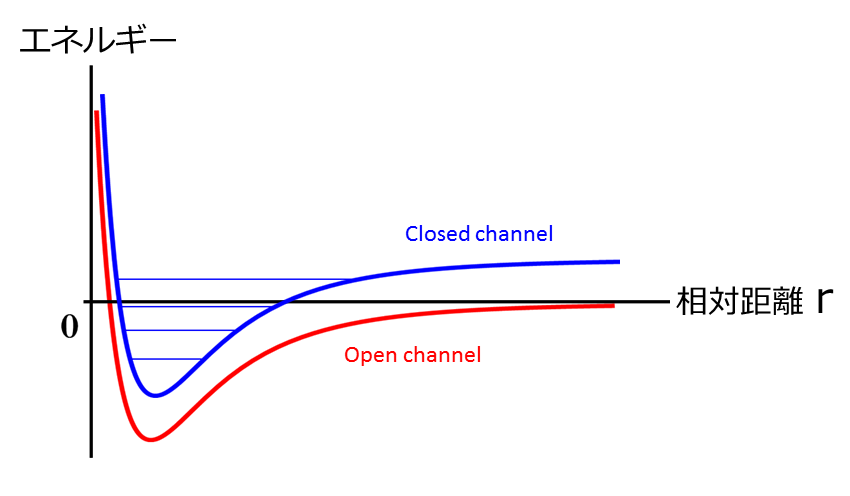 実際に基底状態の断熱ポテンシャルの深さを変えることは出来ませんが、自由な2原子のエネルギーと他の内部状態からなる2原子分子のエネルギーとが元々比較的近いところにあった場合、静磁場を加えることで両者のエネルギー差を制御し、共鳴的な散乱を人工的に誘起することができます。このようにして散乱長 a を制御することを Feshbach 共鳴と呼びます。